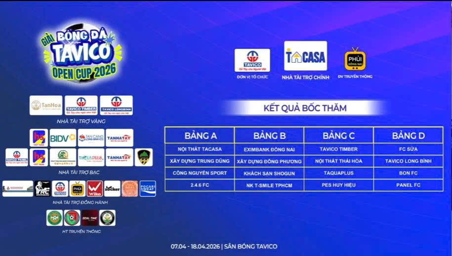 Những cặp đấu được hình thành hứa hẹn mang đến các trận cầu kịch tính – hấp dẫn – cạnh tranh cao, góp phần tạo nên sức nóng cho Tavico Open Cup 2026 ngay từ những ngày đầu khởi tranh.